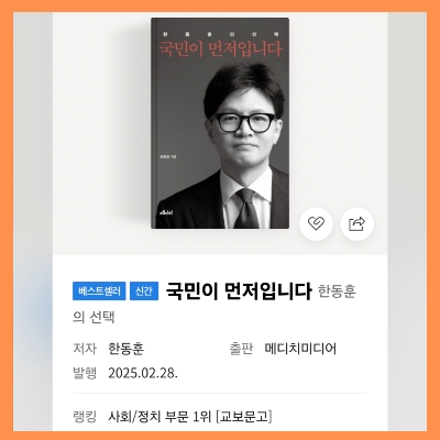 한동훈 책은 예약 판매가 시작된 지 6시간 만에 1만 부 이상 판매되며, 국내 주요 서점 종합 베스트셀러 1위에 올랐습니다. 이는 정치사회 분야 서적으로는 이례적인 성과로, 독자들의 높은 관심을 반영하고 있습니다.